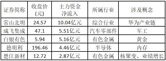 从主力资金来看,今日涨停板个股中,主力资金净流入金额排名前5的个股分别为常山北明、成飞集成、白银有色、德明利、楚江新材。