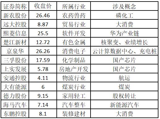 涨停板个股中,股价创出近一年新高的个股有12只(不包括创出历史新高的个股),包括新农股份、远大控股、熙菱信息、楚江新材、京泉华、三孚股份、上实发展、安通控股、大有能源、德力股份、海马汽车、东鹏控股,具体如下表所示。