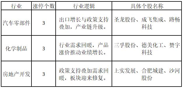 从行业特征来看,今日涨停板个股中,汽车零部件、化学制品、房地产开发行业的个股最多。