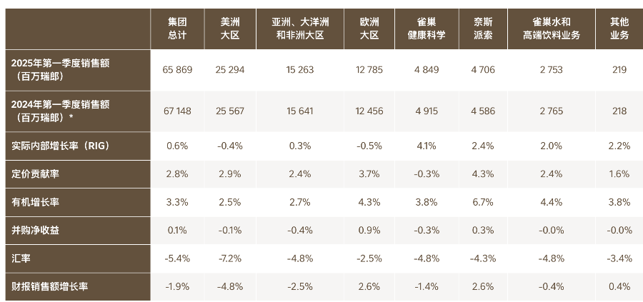 同天披露的财报显示,在今年前9个月中,雀巢集团的总销售额为659亿瑞士法郎,同比下降1.9%。有机增长率为3.3%,所有大区和全球直管业务均实现正增长。实际内部增长率增至0.6%,定价贡献率稳定在2.8%。汇率变动带来了5.4%的负面影响,净收购则带来0.1%的正面影响。