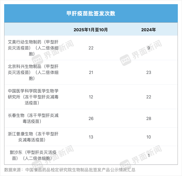 界面新闻记者统计批签发数据后发现,2024年全年和2025年1月至10月,默沙东甲肝疫苗仅获1次批签发,而其在2023年全年也仅获2个批次的批签发,且均在2023年上半年,其中包括2月获1批次甲肝疫苗和6月获1批次甲肝疫苗。