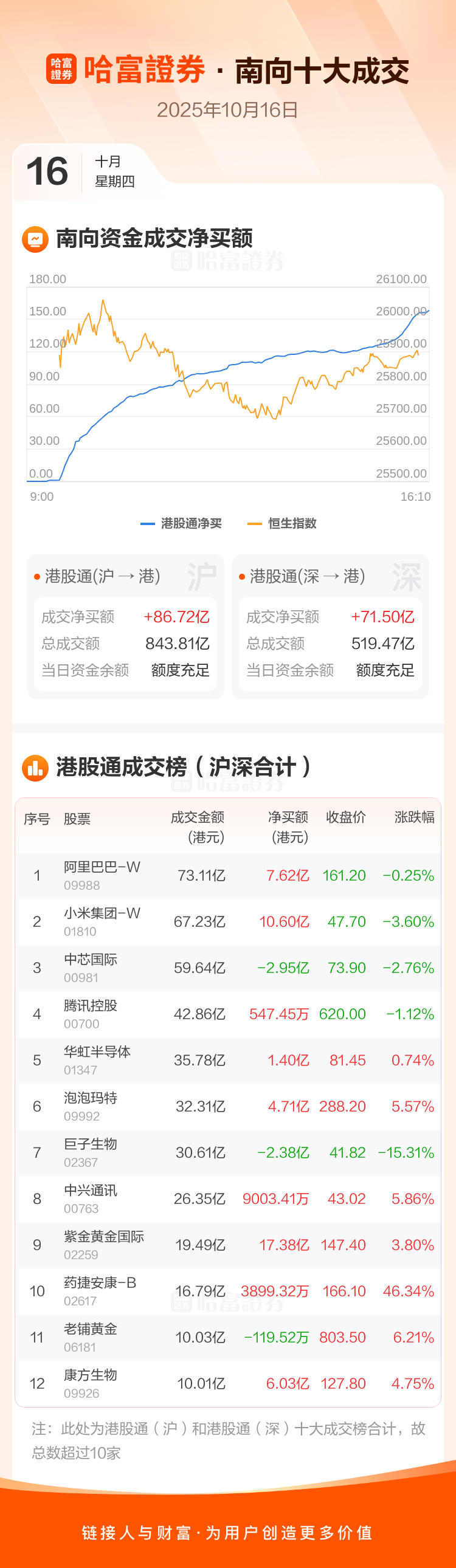 恒生指数10月16日跌0.09%,收报25888.51点。南向资金今日净买入港股158.22亿港元。南向资金今日成交额1363.27亿港元,港股大市成交2754.31亿港元。