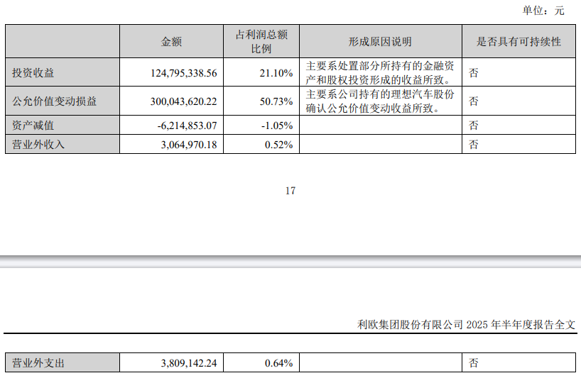 利欧股份的公允价值变动损益主要受公司持有的理想汽车股份股价变动影响。根据利欧股份2025年5月份披露的投资者关系活动记录表,截至目前,公司仍持有理想汽车股票折合ADS不到1000万股,其股价波动会对公司的当期报表净利润产生一定的影响,但其股价波动主要为暂时性的账面影响。
