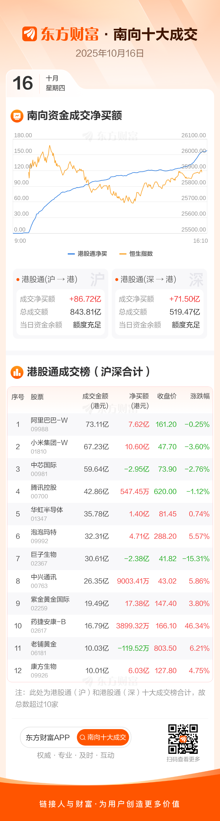 10月16日南向资金净买逾158亿港元,逾17亿抢筹紫金黄金国际