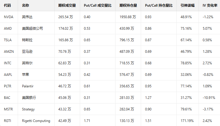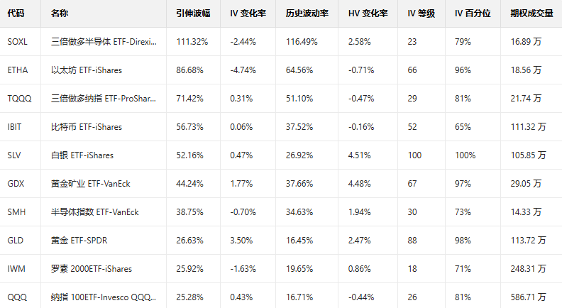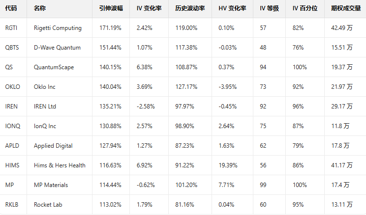 美股引申波动幅度排行榜前十(标的市值>100亿美元,且期权成交量>10万美元)