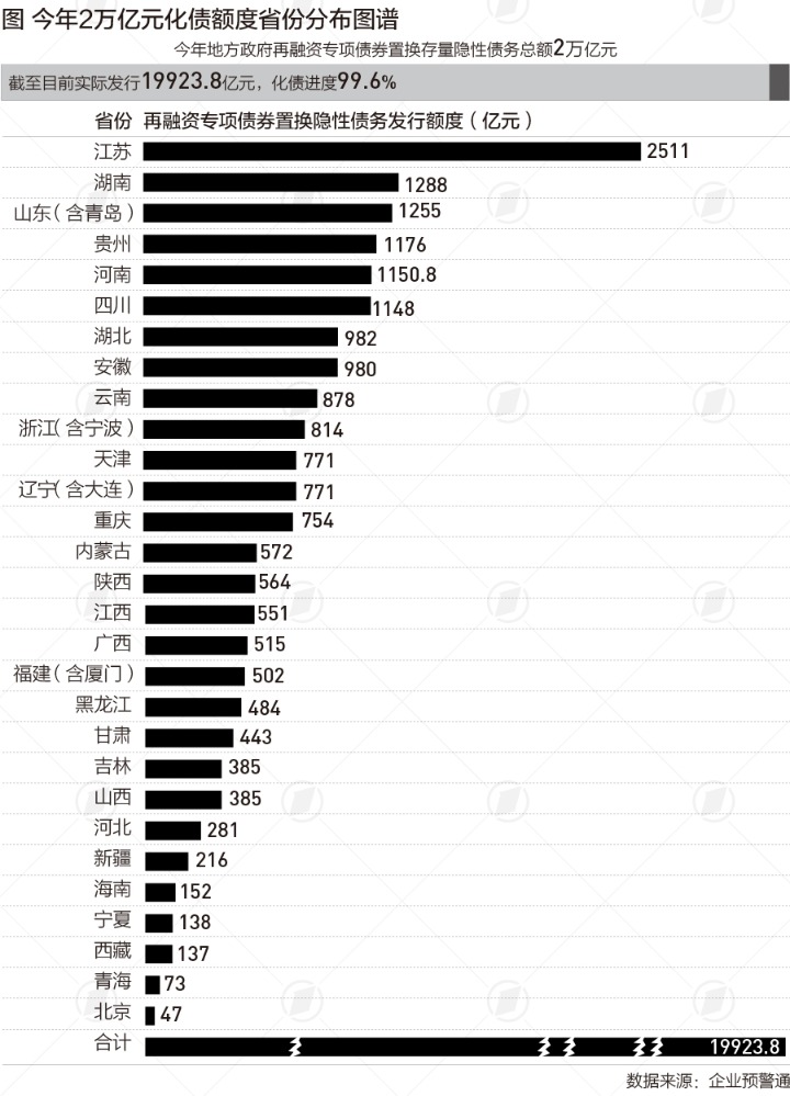根据企业预警通数据,截至今年10月16日,有29个省份累计发行约1.99万亿元再融资专项债券用于置换存量隐性债务(下称“化债额度”),基本完成今年2万亿元隐性债务置换计划。