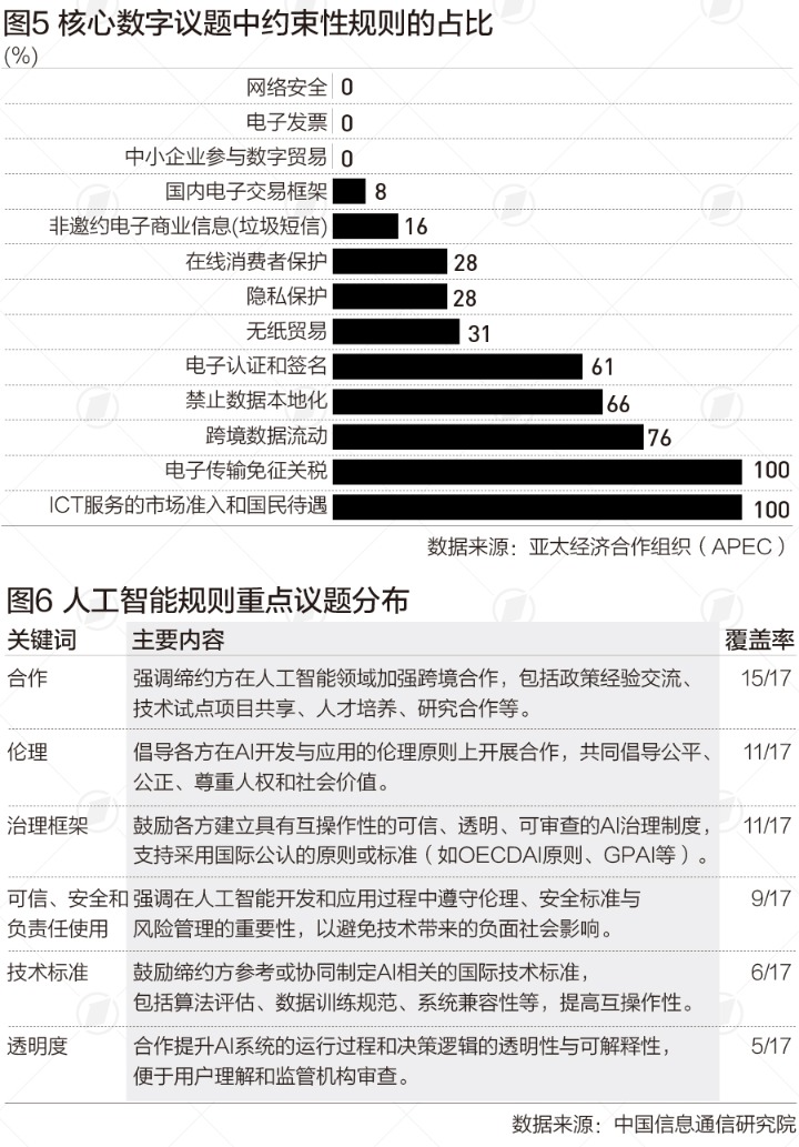 《报告》称,一是AI新型服务涌现使现行数字服务规则产生一定滞后性;二是为应对AI带来的数据非法获取与泄露风险需对数据跨境流动、个人信息保护等规则进行完善。“数字经贸规则进一步纳入人工智能等新兴技术议题,强化在技术研发、安全监管、伦理治理等领域合作。目前,已有17项国际经贸协定中含有涉及AI技术的相关规则。”