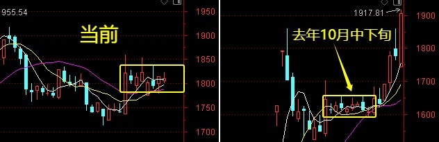 去年10月18日-10月30日,证券板块指数出现了这种走势形态,之后大盘及券商股迎来了一波涨幅不算太大的行情。
