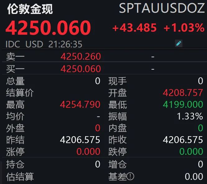 10月16日,国际金价稳稳站上4200美元/盎司上方,并延续涨势。截至记者发稿,伦敦金现报4250.06美元/盎司,日内涨1.03%,盘中最高触及4254.79美元/盎司,再创历史新高。