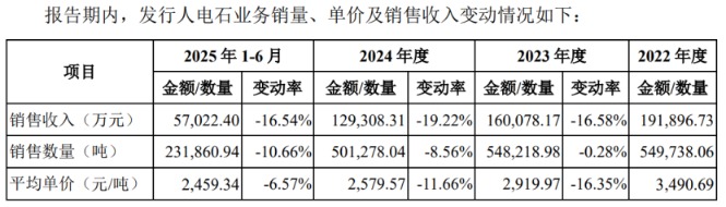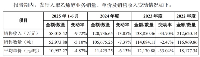 报告期内,公司主要产品电石产品业务销量、单价及销售收入逐年下降。其中,销量由2022年的54.97万吨降至2025年上半年的23.19万吨,单价则由3490.69元/吨降至2459.34元/吨。此外,聚乙烯醇业务销量、单价及销售收入也逐年下降,醋酸乙烯和特种纤维业务销量、单价及销售收入整体有所下降。