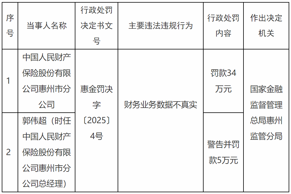 10月15日,国家金融监督管理总局惠州监管分局发布的行政处罚信息显示,因财务业务数据不真实,中国人民财产保险股份有限公司惠州市分公司被罚款34万元,郭伟超(时任中国人民财产保险股份有限公司惠州市分公司总经理)被警告并罚款5万元。
