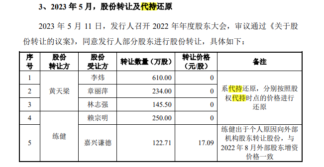 福建德尔历史上还存在股权代持问题。据招股书披露,实际控制人黄天梁曾为多位自然人代持股份,而相关代持关系的清理和还原工作主要集中在临近IPO申报的阶段。值得注意的是,2023年5月(即正式提交申报材料前一个月),黄天梁解除了对李炜所持610万股股份的代持关系。若以本次IPO预估估值计算,该笔股份可为李炜带来约1.5亿元的账面收益。