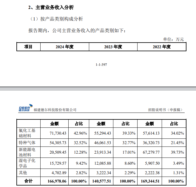 这背后的主要原因是新能源电池材料业务因产能过剩导致价格下跌。招股书显示,核心产品六氟磷酸锂2022-2024年单价从27.73万元/吨降至4.64万元/吨。该板块营收从6.73亿元降至2.05亿元,毛利率从44.84%减至7.95%。