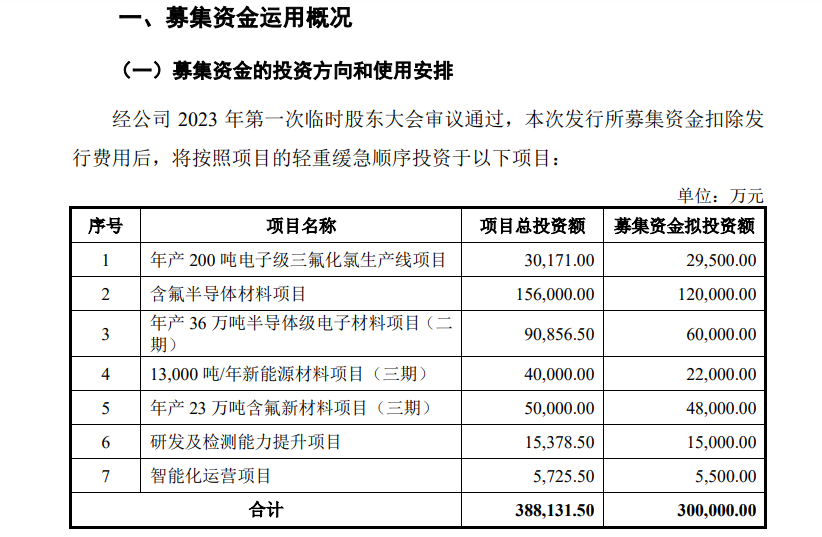 或许是在监管问询下,福建德尔2025年6月30日披露的第二版招股书,将公司的融资金额缩减至19.45亿元,募投项目也缩减至3个,砍掉了新能源材料相关项目,留下了半导体新材料,包括年产200吨电子级三氟化氯生产线项目、含氟半导体材料项目、年产36万吨半导体级电子材料项目(二期)。