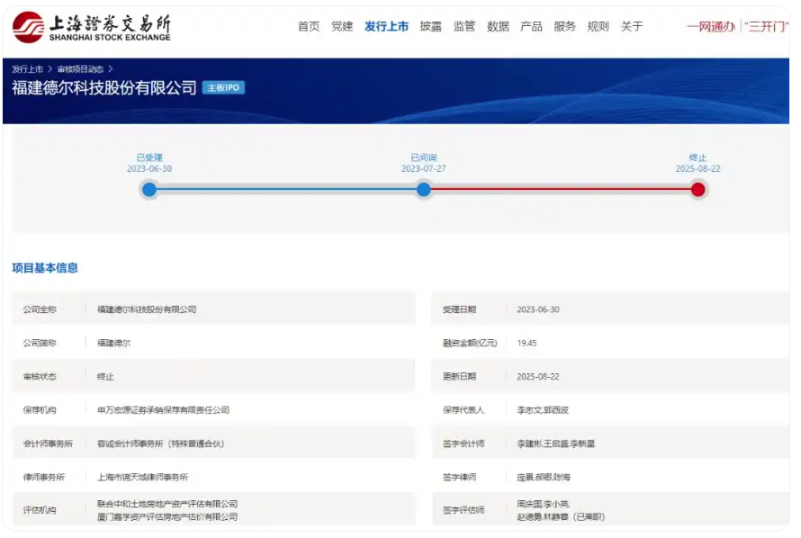 近日,上交所官网信息显示,福建德尔上交所主板IPO状态变更为终止,原因为公司及其保荐人撤回发行上市申请。