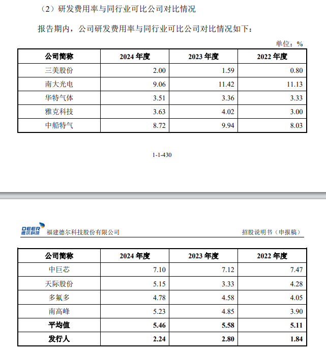 福建德尔招股书认定的同行有9家。以2024年来看,8家同行的研发费用率均高于福建德尔,5家同行均在5%以上,最高的南大光电(300346)达到9.06%。从行业平均值来看,2022-2024年分别为5.11%、5.58%、5.46%,福建德尔的研发费用率不如行业均值。