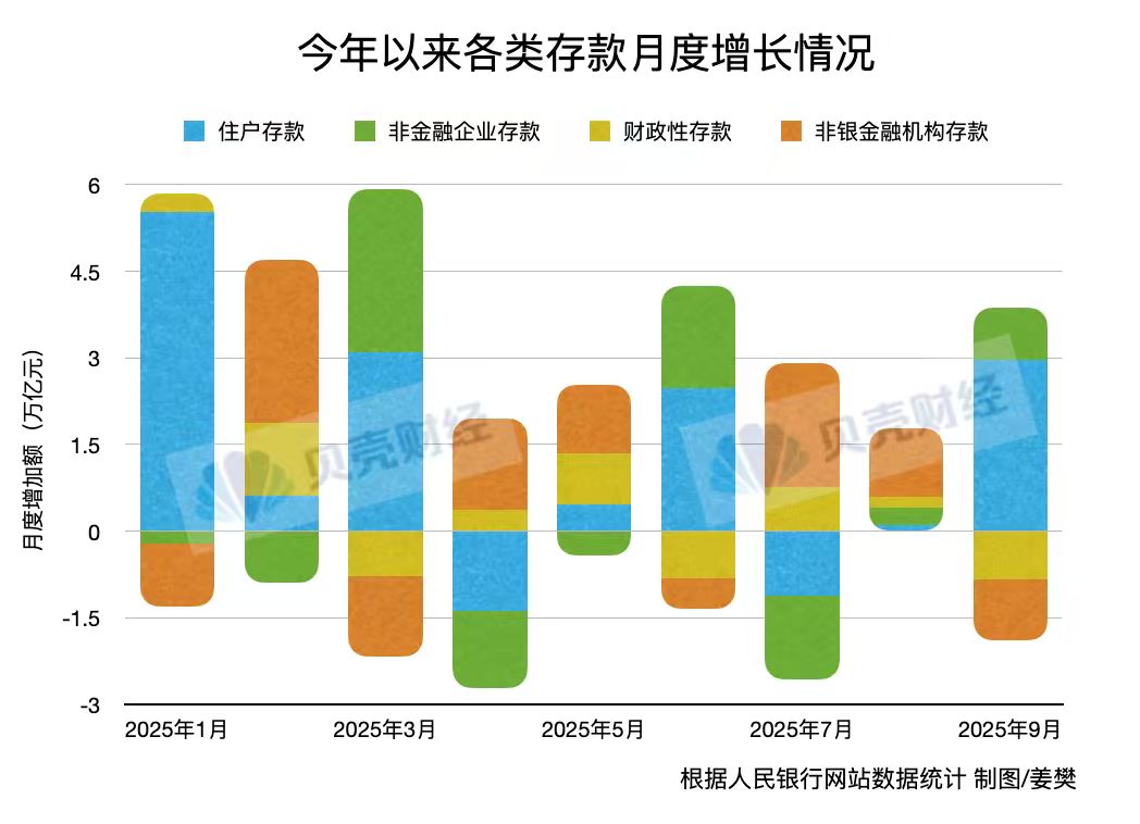 9月人民币存款中,住户存款大涨2.96万亿元,非金融企业存款增加9194亿元。财政性存款和非银金融机构存款分别减少8400亿元和1.06万亿元。
