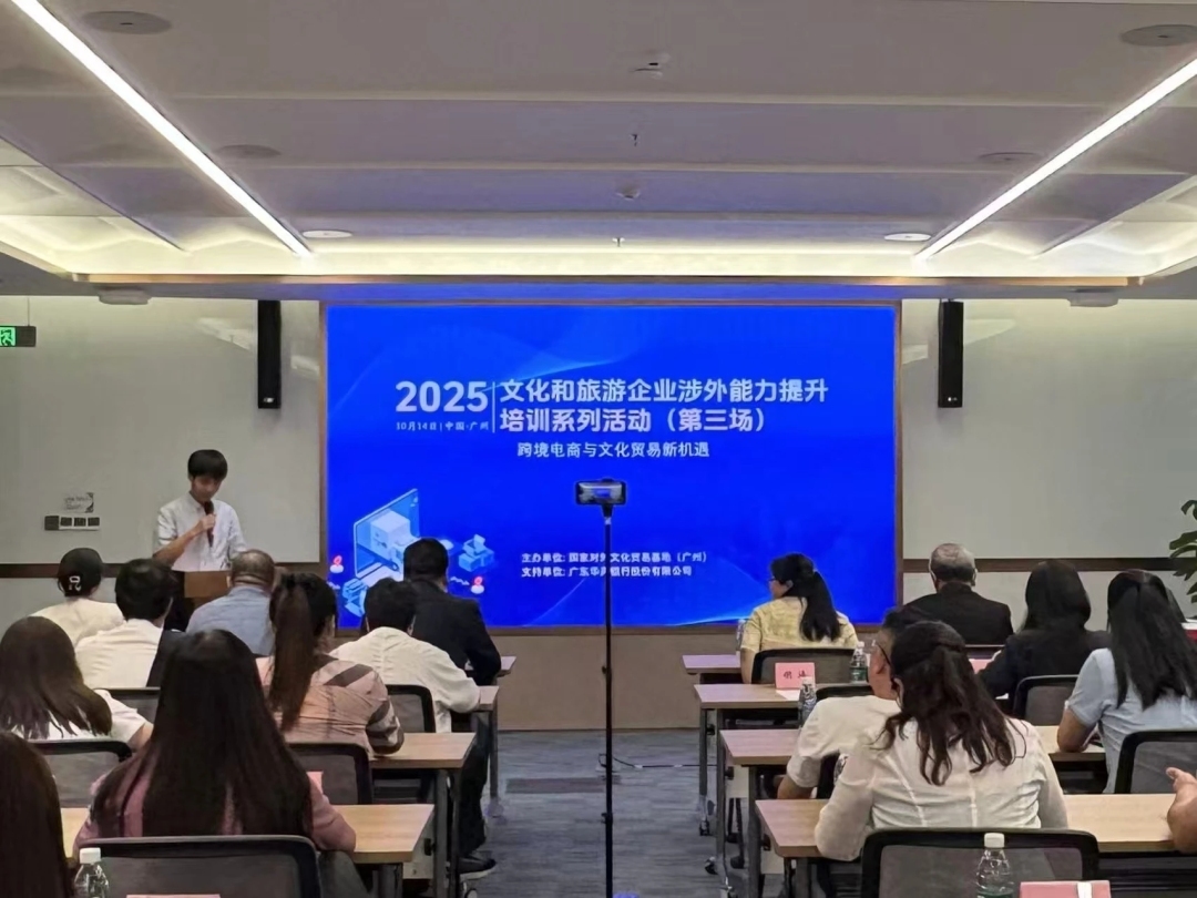 10月14日,由国家对外文化贸易基地(广州)主办、广东华兴银行股份有限公司支持的“文化和旅游企业涉外能力提升培训系列活动(第三场)——跨境电商与文化贸易新机遇”在广州举办。本次活动聚焦数字经济背景下的文化贸易与跨境电商融合路径,为近百名来自文旅企业、跨境电商平台、法律服务机构和行业协会参会者搭建起专业交流平台,助力文旅产品与服务加速“走出去”。