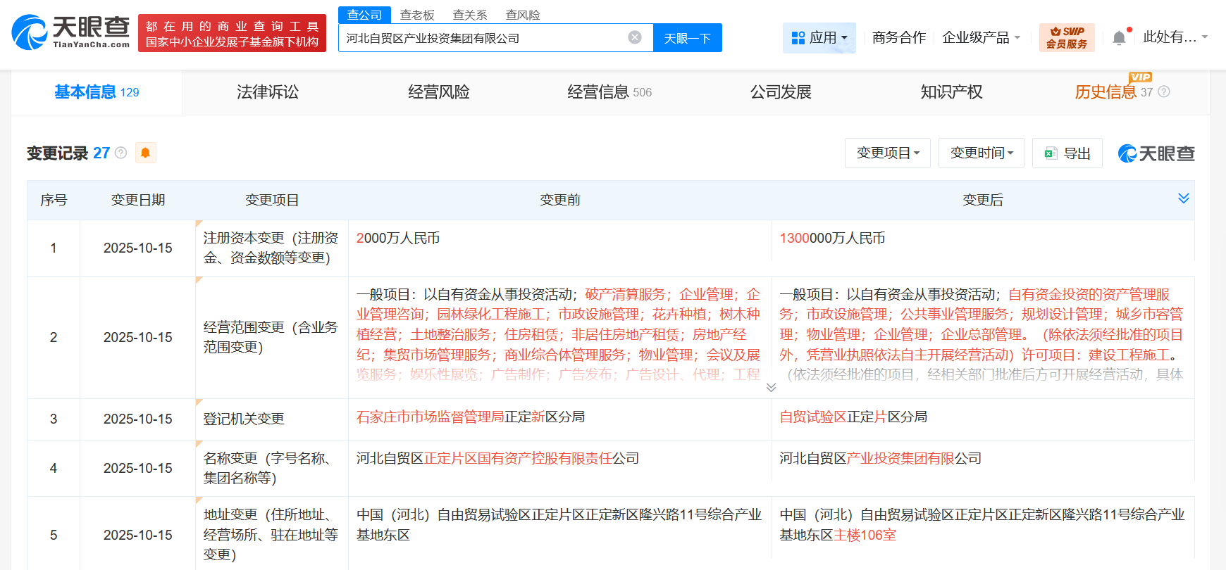 南方财经10月16日电,天眼查App显示,10月15日,河北自贸区正定片区国有资产控股有限责任公司发生工商变更,企业名称变更为河北自贸区产业投资集团有限公司,同时,注册资本由2000万人民币增至130亿人民币,增幅64900%。该公司成立于2011年12月,法定代表人为李毅飞,经营范围含以自有资金从事投资活动、自有资金投资的资产管理服务、市政设施管理、公共事业管理服务、规划设计管理、城乡市容管理、物业管理、企业管理等。股东信息显示,该公司由石家庄综合保税区管理委员会(中国(河北)自由贸易试验区正定片区管理委员会)全资持股。