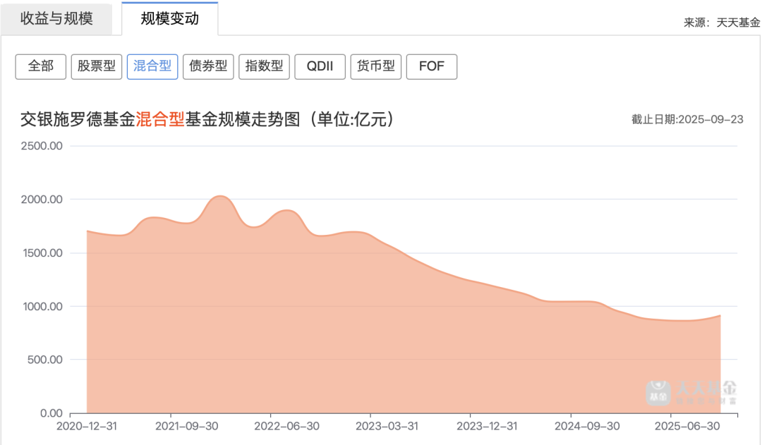天天基金网数据显示,截至今年9月23日,交银施罗德混合型基金管理规模约911亿元,行业排名第11位;较其2021年历史新高的2027亿元管理规模,缩水约1100亿元。