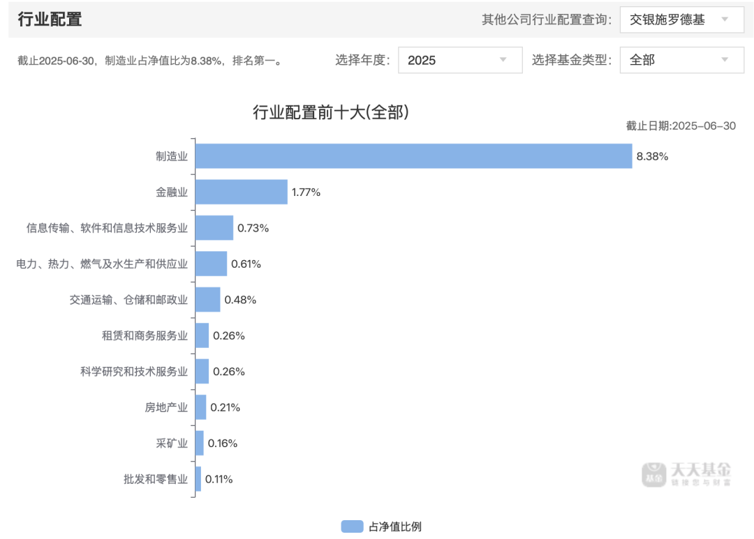 究其原因,或许与交银施罗德不爱追风口有关。近两年来,AI与科技股大行情的持续被追捧,超出了大部分机构投资者的预期。同期,稳居交银施罗德行业配置榜首的则是制造业与金融业。