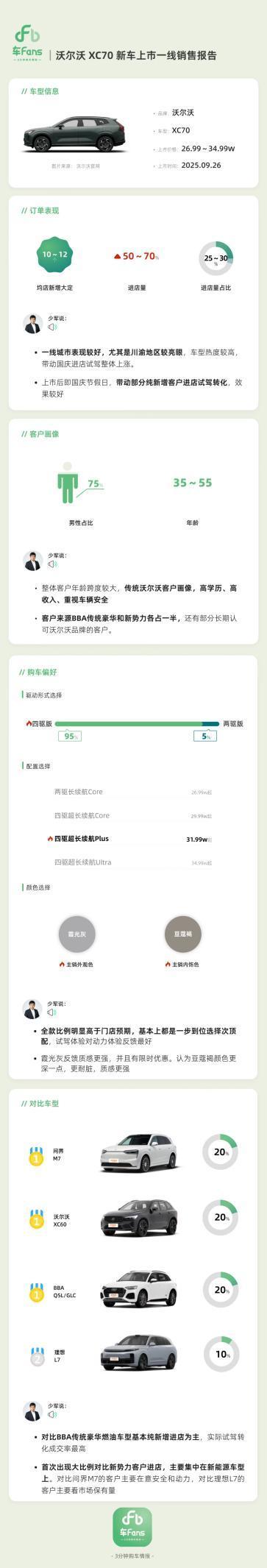 从用户画像看,新车吸引了35-55岁、高学历、高收入的男性客群。配置选择上,四驱超长续航Plus版成为绝对主销,四驱车型占比更是高达95%,此外,霞光灰外观与豆蔻褐内饰备受青睐。区域市场中,一线城市表现强劲。尤为关键的是,首次出现大比例对比新势力品牌的客户进店,标志着全新XC70成功突破传统圈层。