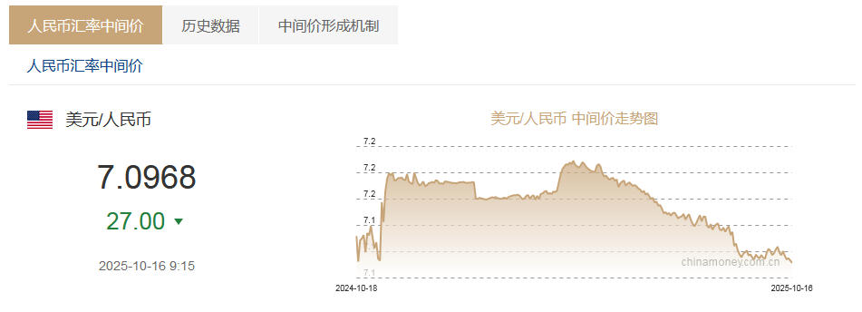 中新网10月16日电据中国外汇交易中心网站消息,中国人民银行授权中国外汇交易中心公布,2025年10月16日银行间外汇市场人民币汇率中间价为:1美元对人民币7.0968元,上调27个基点。