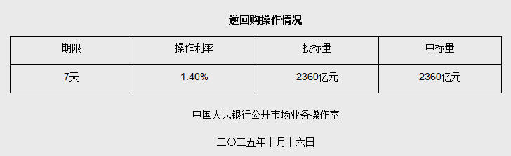 中新网10月16日电据央行网站消息,2025年10月16日中国人民银行以固定利率、数量招标方式开展了2360亿元7天期逆回购操作。具体情况如下: