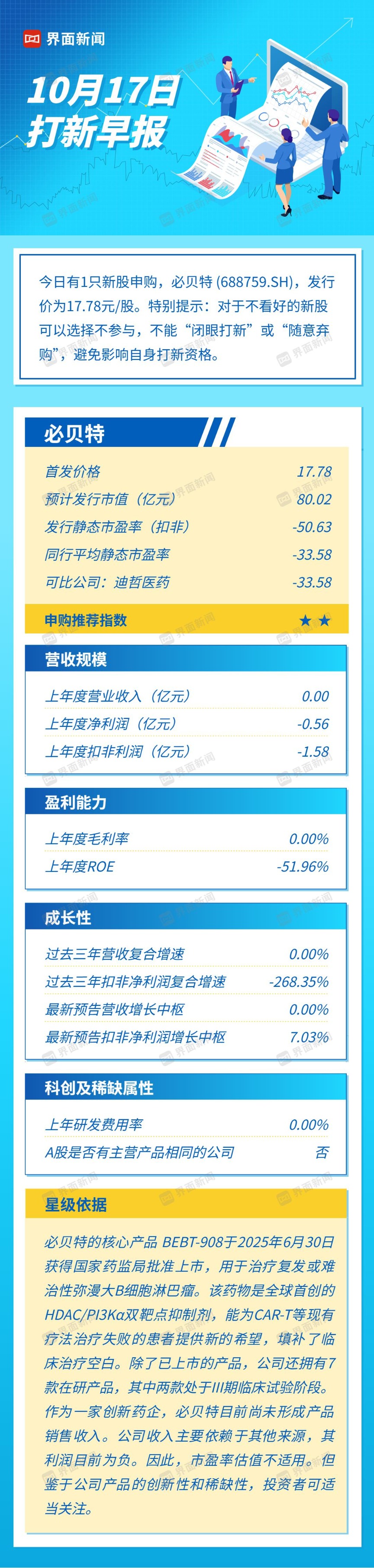 打新早报| 创新药企必贝特启动申购,核心产品已获批上市