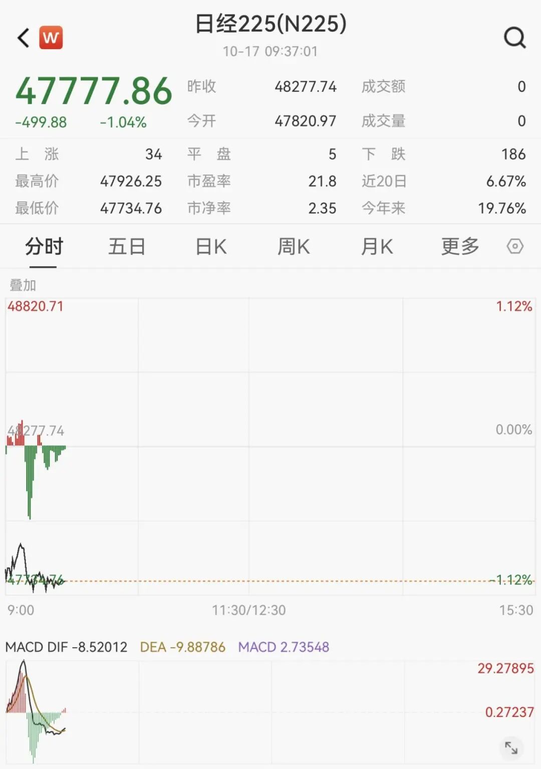 10月17日,日韩股市走低。截至记者发稿时,日经225指数跌幅扩大至1%。