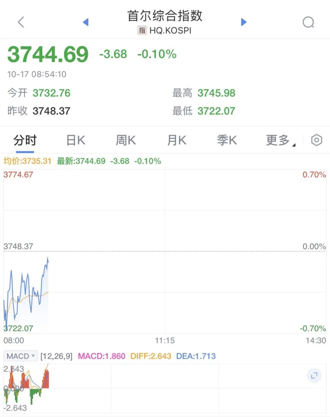 韩国股市低开后震荡调整,韩国综合指数现报3744.69。