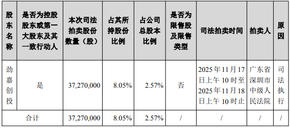 劲嘉创投本次被司法拍卖的股份数量为37,270,000股,占其所持股份比例8.05%,占公司总股本比例2.57%,司法拍卖时间为2025年11月17日上午10时至2025年11月18日上午10时止。上述司法拍卖的股份此前已被广东省深圳市中级人民法院冻结。