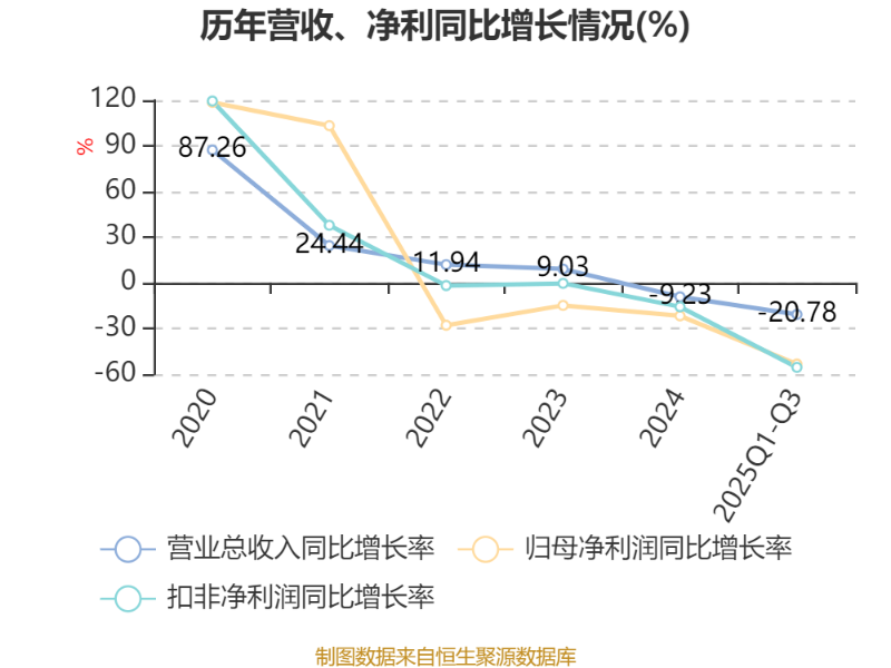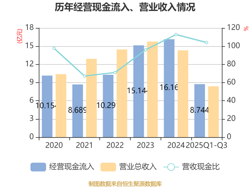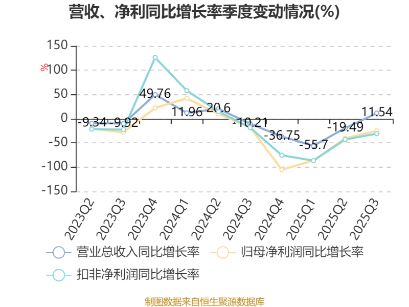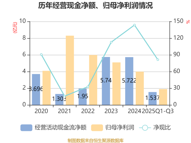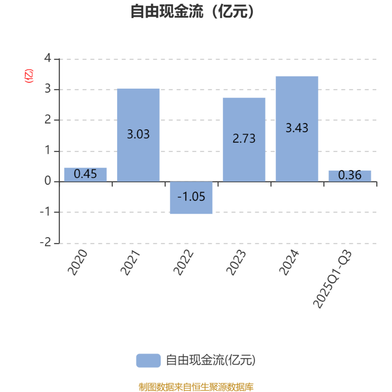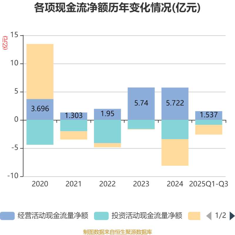 2025年前三季度,公司经营活动现金流净额为1.54亿元,同比下降39.22%;筹资活动现金流净额-1.73亿元,同比增加2.64亿元;投资活动现金流净额-8768.36万元,上年同期为-9455.32万元。