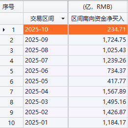 Choice统计数据显示,截至10月15日,今年以来南向资金净流入额已超过1.1万亿元人民币,创历年之最。在今年前10个月中,有7个月南向资金净流入额超过1000亿元。10月以来截至10月15日,尽管港股市场出现调整,南向资金仍然净流入234.71亿元。