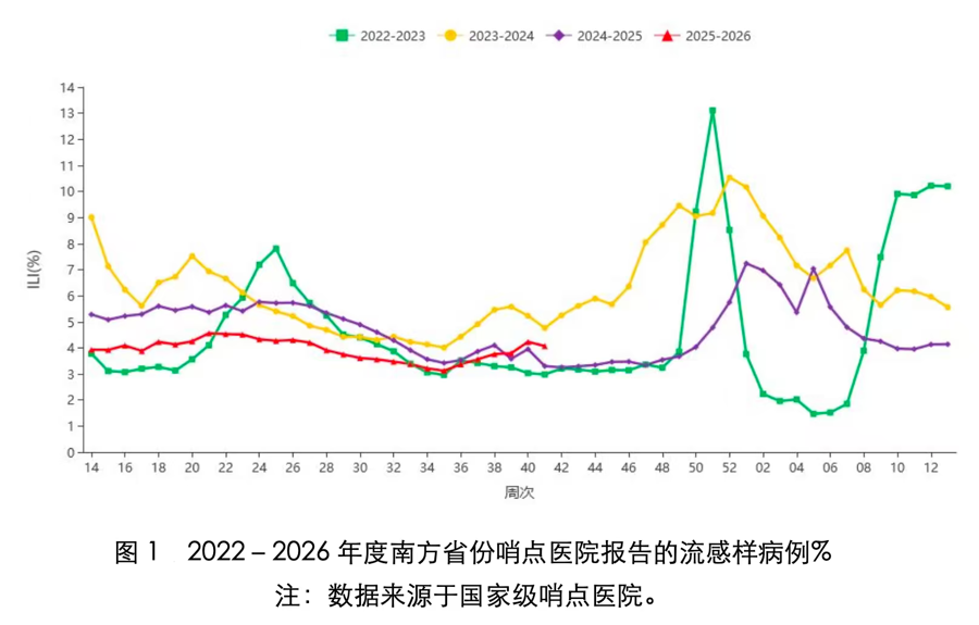 近日气温有所下降,我国流感发病情况如何?胡必杰表示,根据国家流感中心通报的数据,今年第41周(10月6日至12日),南方省份哨点医院报告的流感样病例占门急诊病例比例(ILI%)为4.1%,低于前一周水平(4.2%)。北方省份哨点医院报告的ILI%为2.8%,低于前一周水平(3.2%)。可以说,我国流感发病目前总体平稳,处于低位。