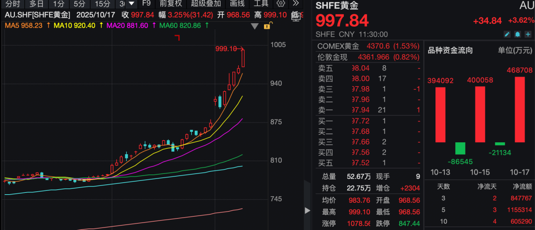 10月17日早盘,国内期货市场沪金主力合约2512大幅冲高,一度触及998.04元/克,距千元大关一步之遥,较9月末874.4元/克的价格涨幅超14%。