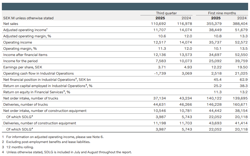 10月17日,沃尔沃集团发布2025年第三季度财报:净销售额为1107亿瑞典克朗,同比下降5%;调整后营业利润为117亿瑞典克朗,上年同期为141亿瑞典克朗。
