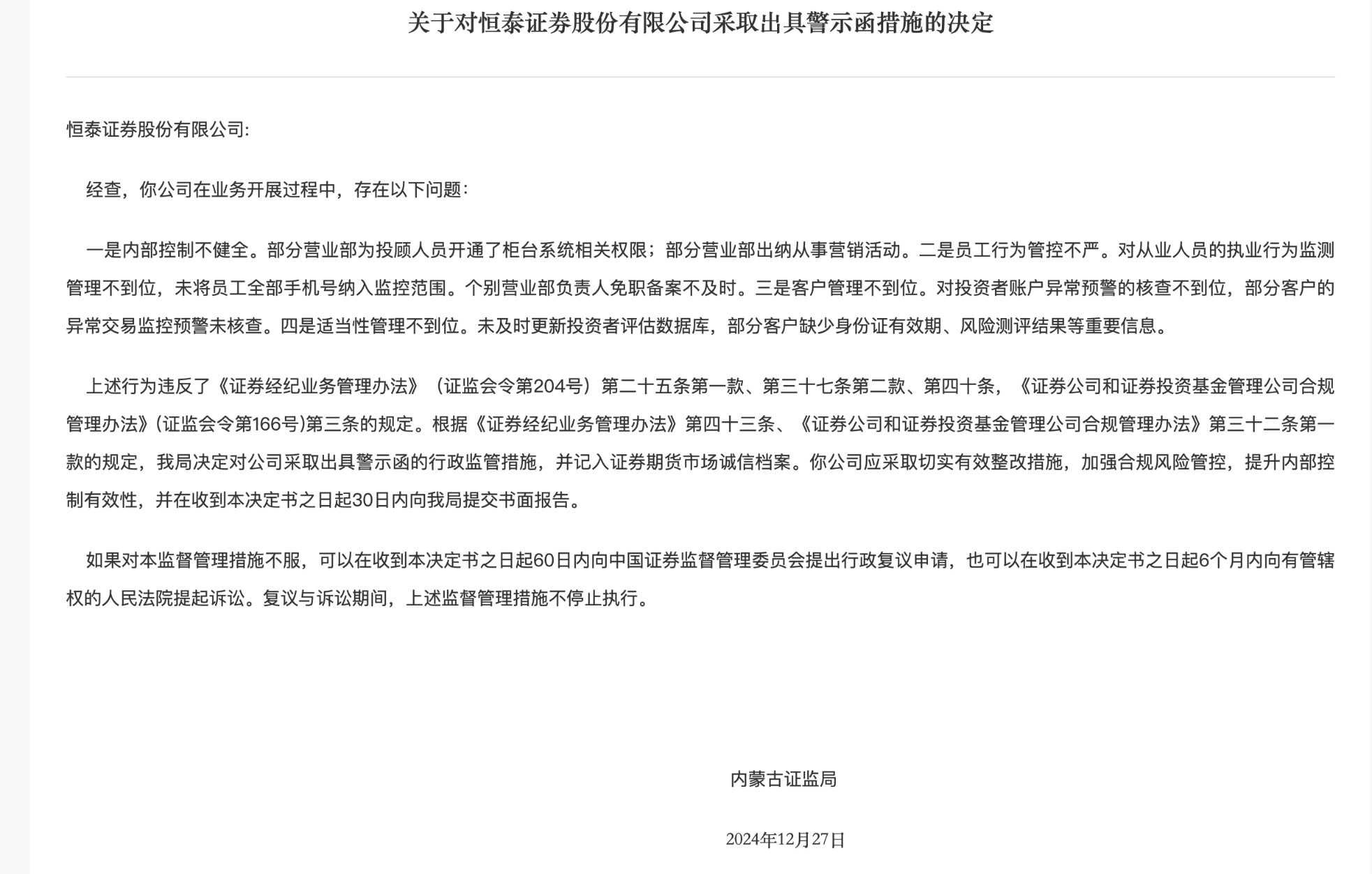 2024年12月,金融街证券因部分营业部违规为投资顾问人员开通柜台系统相关权限,同时存在“出纳从事营销活动”的岗位越界行为、员工行为管控不严、客户管理不到位以及适当性管理不到位等原因,被内蒙古证监局出具警示函并记入档案。