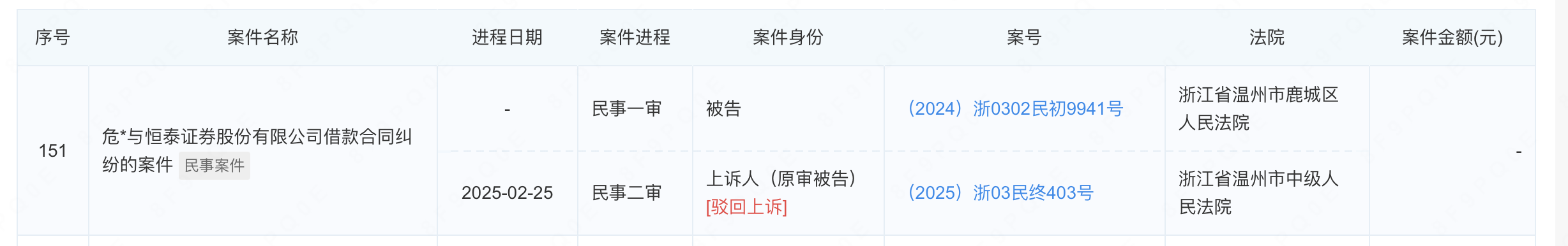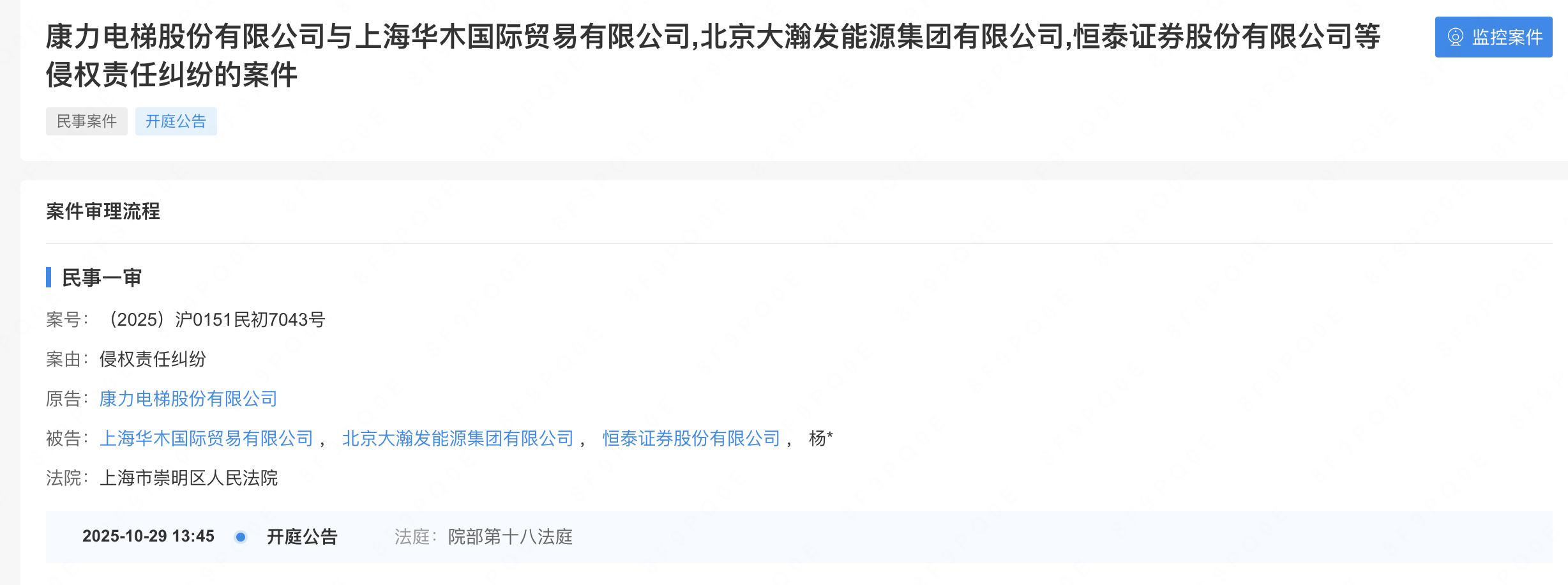 而此次将于10月29日的开庭,则涉及2024年1月康力电梯提起的诉讼,康力电梯以恒泰证券、北京大瀚发、上海华木及个人杨凯构成共同侵权为由向苏州市虎丘区法院起诉,恒泰证券于2024年7月5日提出管辖异议,但于2024年10月14日被虎丘法院裁定驳回。在恒泰证券继续上诉后,苏州中院最终于2024年11月29日撤销前述裁定并将案件移送上海市崇明区人民法院;2025年5月19日崇明法院作出受理决定,并定于近期开庭。