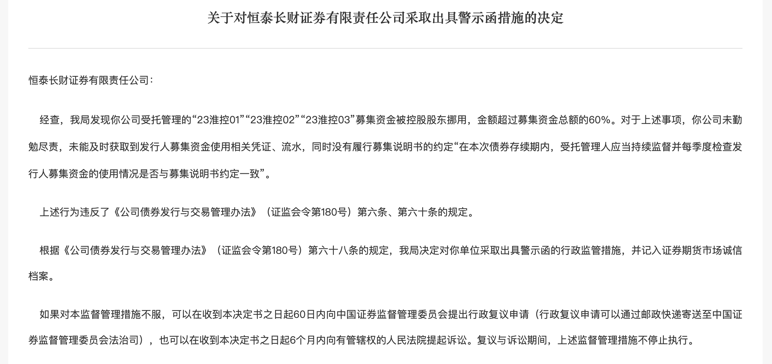 9月,安徽证监局又对金融街证券全资子公司恒泰长财证券出具警示函,原因在于其作为“23淮控01/02/03”公司债受托管理人,对募集资金被控股股东挪用未尽勤勉尽责、持续监督不到位。