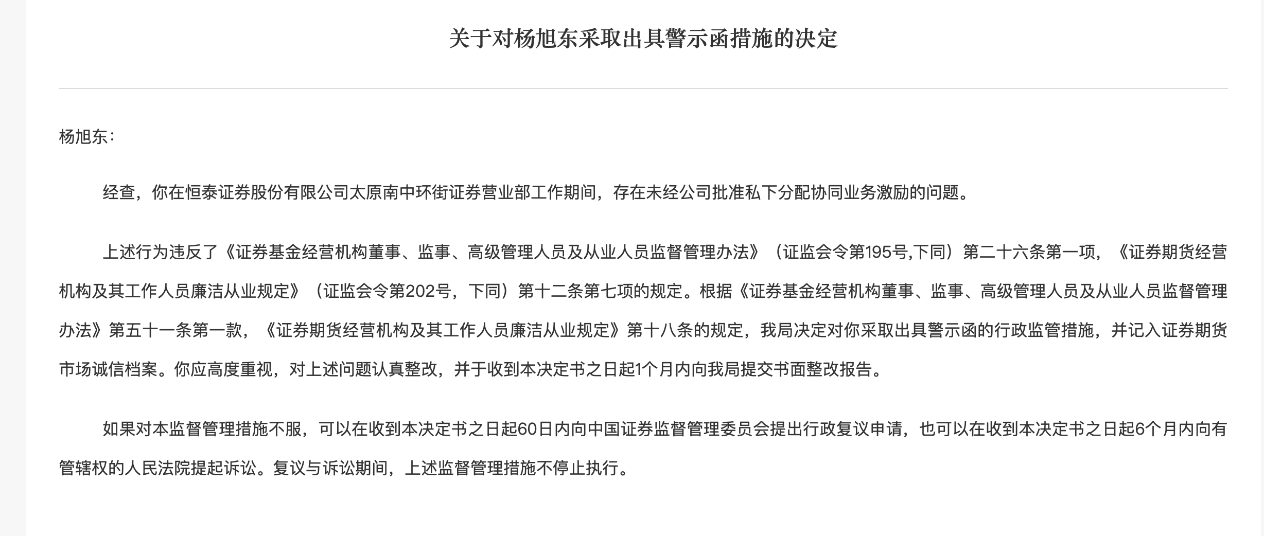 随后在8月,公司太原南中环街证券营业部负责人杨旭东因未经批准私下分配协同业务激励的问题再次被山西证监局出具警示函并记入诚信档案。