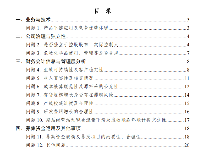 10月15日,九目化学在北交所更新了上市申请审核动态,公司已收到第一轮审核问询函。这份问询函包含四大类共计12个问题,涉及业务与技术、公司治理与独立性、财务会计信息与管理层分析、募集资金运用及其他事项。