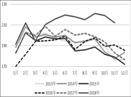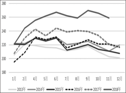 图为2013—2018年日均粗钢产量(单位:万吨)