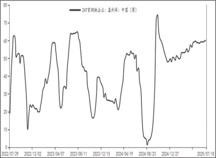 历经2024年的价格持续下跌与产量削减,至2024年年末,我国钢材产量与库存均实现阶段性出清。与此同时,钢厂利润自亏损状态逐步向盈利方向修复。2025年上半年,螺纹钢和热卷生产始终维持正利润运行态势。钢厂盈利比例也从2024年的36%攀升至55%。