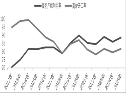 当前,钢铁行业的过剩程度较上一个周期有所减轻。2012—2015年,钢厂开工率在94%~99%,然而产能利用率仅为71%~81%。与之形成对比的是,2021—2025年,钢厂开工率在78%~82%,产能利用率则为85%~89%。产能利用率的提升以及开工率的下降,表明行业结构得到了进一步优化,行业效率也有所提高。