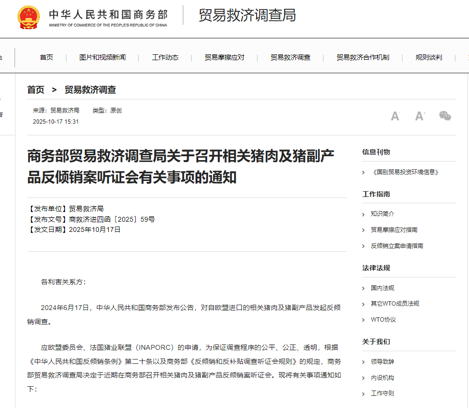上证报中国证券网讯据商务部10月17日消息,应欧盟委员会、法国猪业联盟(INAPORC)的申请,为保证调查程序的公平、公正、透明,根据《中华人民共和国反倾销条例》第二十条以及商务部《反倾销和反补贴调查听证会规则》的规定,商务部贸易救济调查局决定于近期在商务部召开相关猪肉及猪副产品反倾销案听证会。