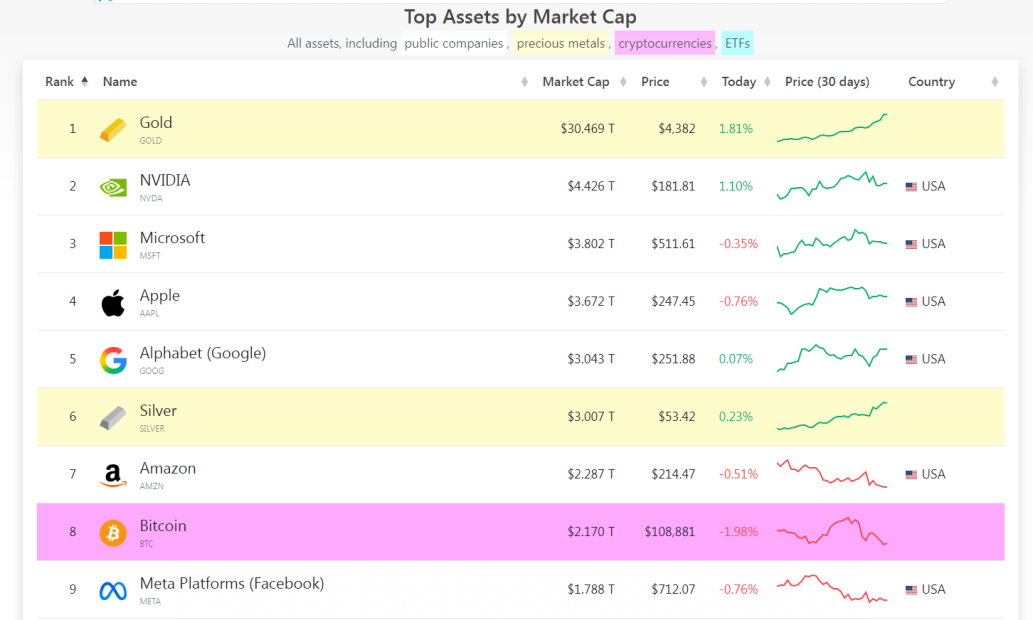 根据CompaniesMarketCap的数据显示,随着金价屡创历史新高,黄金目前的总市值已突破了30万亿美元,在全球资产市值排行榜上断层领先。