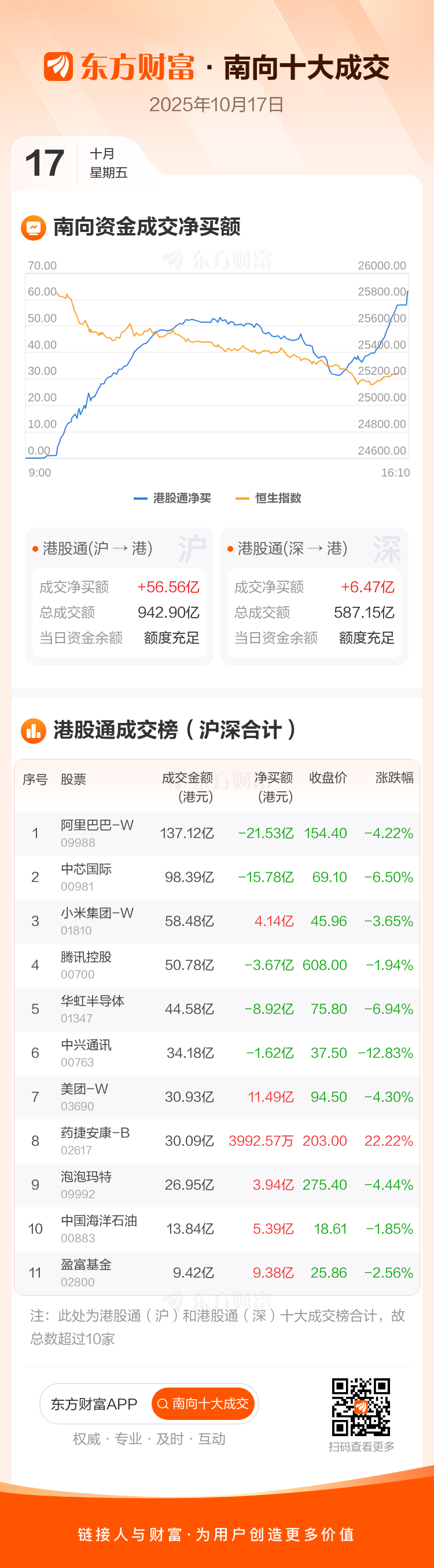 10月17日南向资金净买逾63亿港元,逾11亿抢筹美团-W