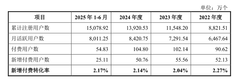 截至2025年6月末,企查查累计注册用户已突破1.5亿,月活跃用户数超过8,000万。自2022年至2025年上半年,企查查产品累计注册用户数分别为8,821.51万、11,548.20万、13,920.53万和15,078.92万,而各期付费用户数则分别为90.62万、102.14万、104.80万和54.83万。