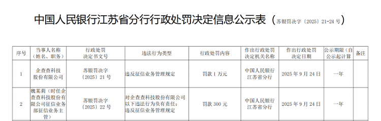 10月9日,中国人民银行江苏省分行发布行政处罚决定信息公示表显示,企查查因违反征信业务管理规定被罚款1万元。时任企查查征信业务部征信业务主管魏某莉对上述违规行为负有责任,被罚款300元。
